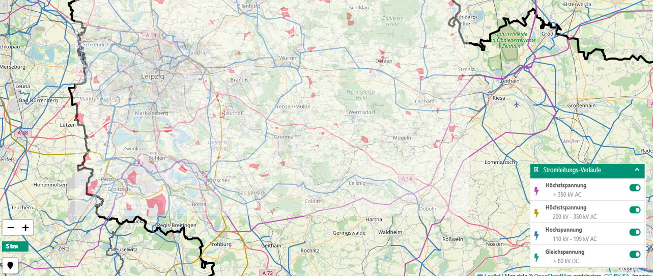 Karte mit Stromverteilnetz – Quellen: RPV Westsachsen & energy-charts.info *